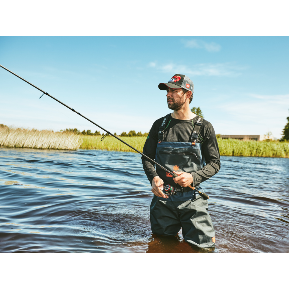 Built from a 4-layer polyester material that offers an optimal balance between durability and breathability. Big external pocket with moisture proof zipper is ideal for bigger tackle box. Inside pocket will keep you most valuable things dry and safe. Rubber boots with neoprene lining for comfort and warms. Includes waterproof phone case and synthetic carry bag.